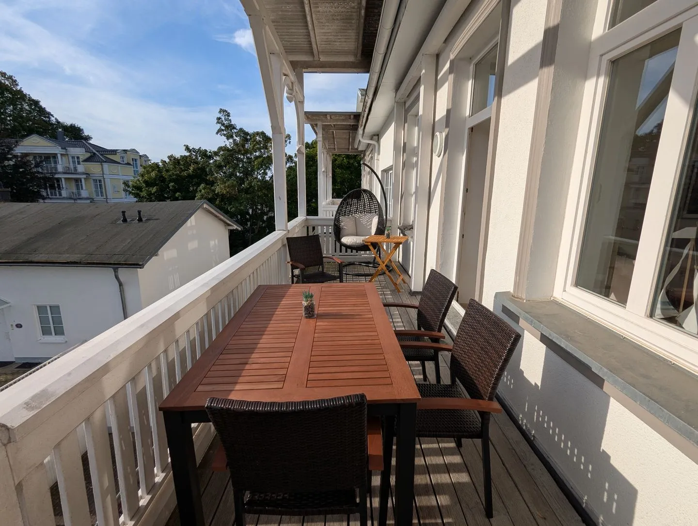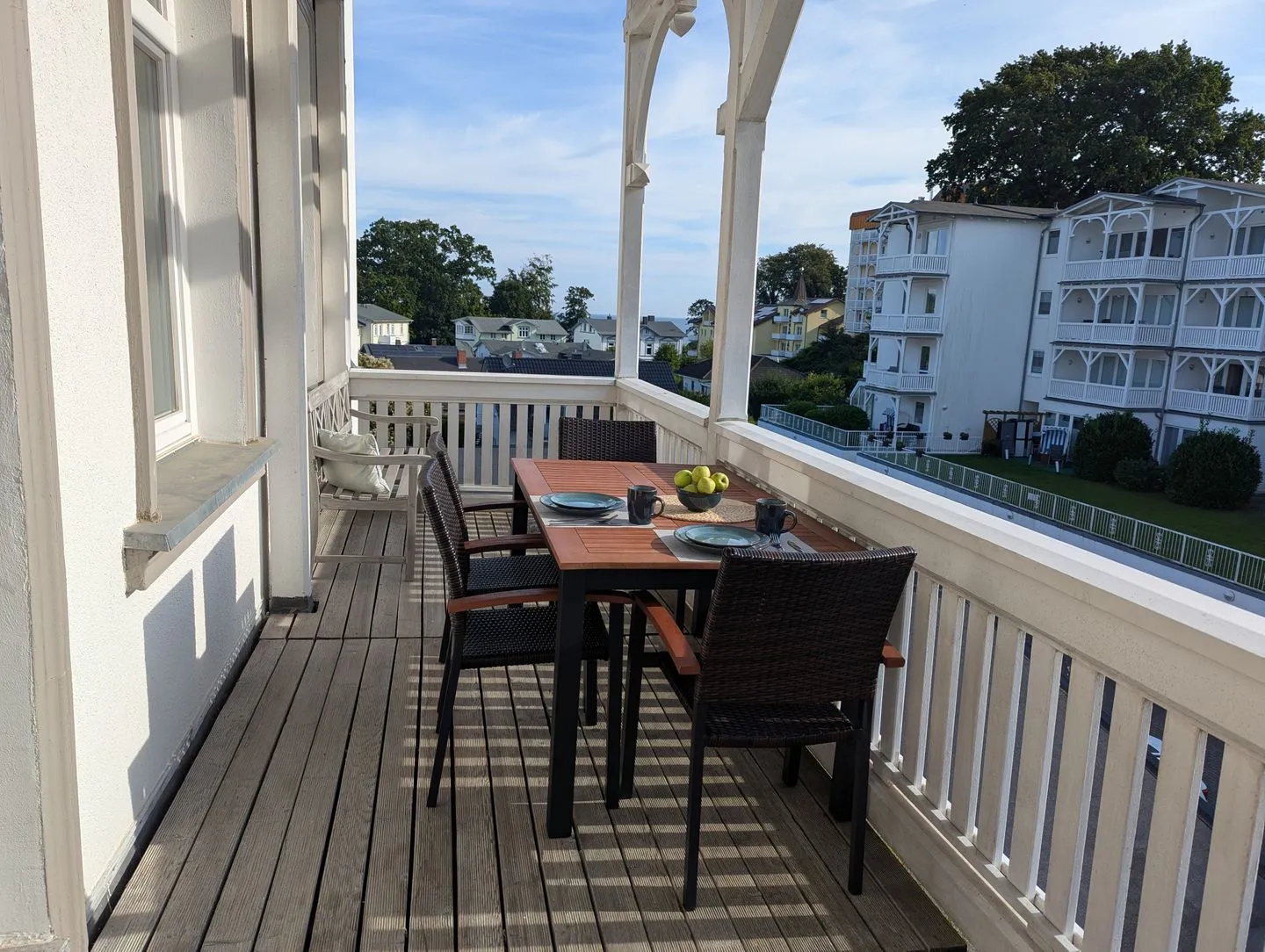 großer Balkon mit Meerblick mit Balkonmöbeln