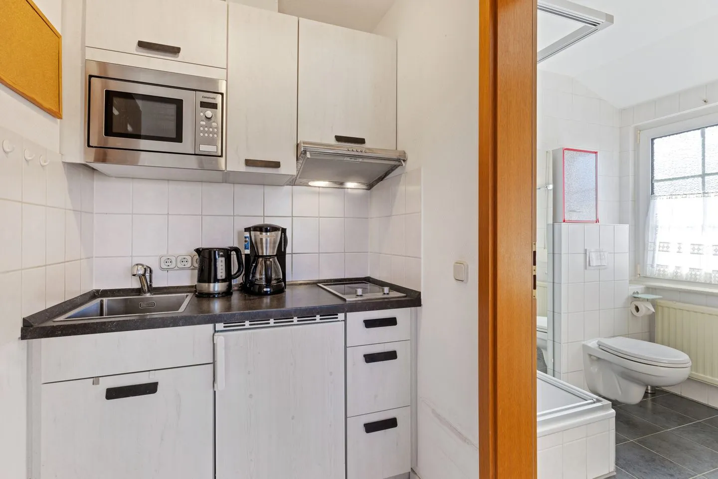 Im Innenbereich erwartet Sie ein funktional und komfortabel ausgestatteter Wohnbereich mit Esstisch, Garderobe, TV mit digitalem Anschluss und WLAN. Die offene Küche ist in den Wohnraum integriert und bietet mit 2-Platten-Herd, Kühlschrank, Kaffeemaschine, Toaster, Wasserkocher, Küchenutensilien sowie Geschirr und Besteck eine praktische Ausstattung für die unkomplizierte Selbstversorgung.