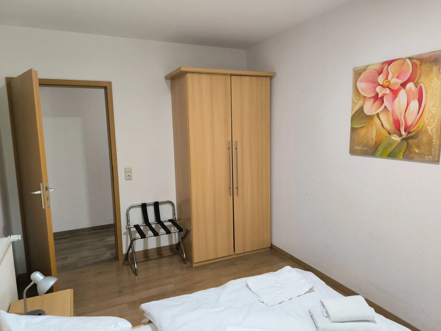 Schlafzimmer mit Doppelbett (180 x 200 cm), Nachttischen, großem Kleiderschrank, Kofferablage