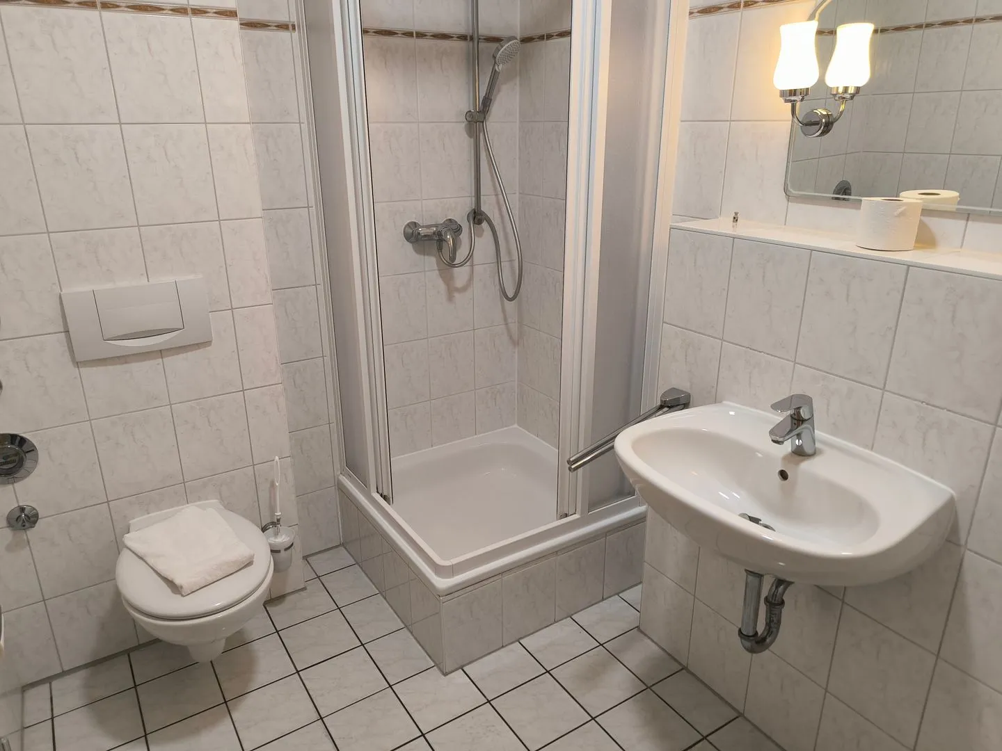 Bad mit Dusche, WC, Föhn und beleuchtetem Kosmetikspiegel