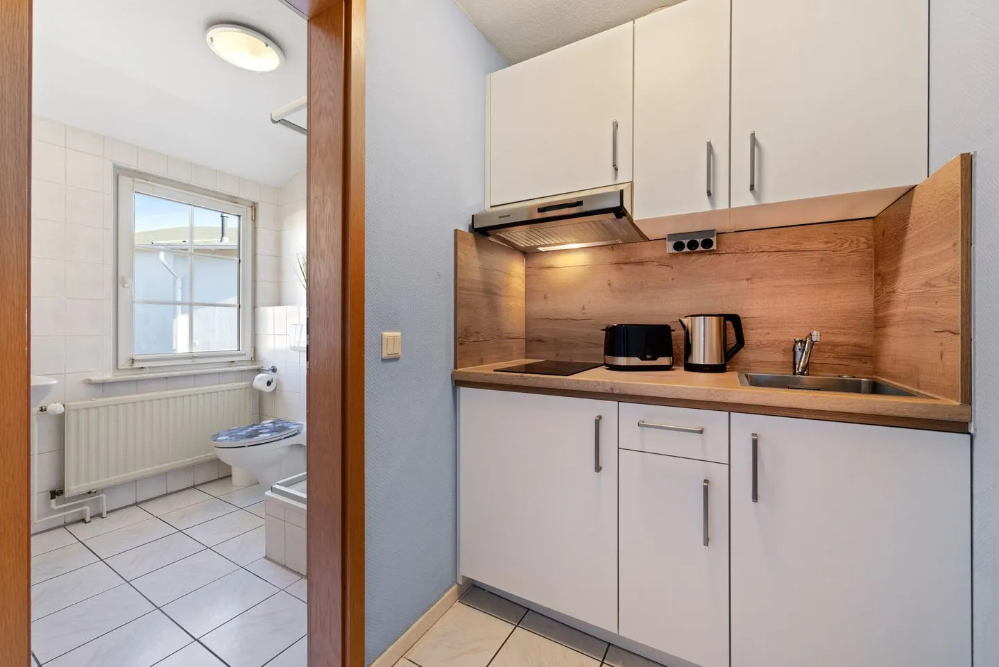 Die Unterkunft befindet sich im 1. Stock und erstreckt sich über eine Ebene. Der Wohnbereich ist mit einer Sofaecke, einem Esstisch, einer Garderobe, einer Kommode sowie einem TV mit digitalem Anschluss ausgestattet. Die offene Küche ist direkt in den Wohnbereich integriert und bietet alles, was Sie für die Zubereitung kleinerer Mahlzeiten benötigen. Zur Ausstattung gehören ein 2-Platten-Herd, Kühlschrank mit Gefrierfach, Kaffeemaschine, Wasserkocher, Toaster, Küchenutensilien sowie Geschirr und Besteck. Ein Abfalleimer ist ebenfalls vorhanden. Vinylboden im Wohn- und Schlafzimmer sorgt für eine pflegeleichte Nutzung.