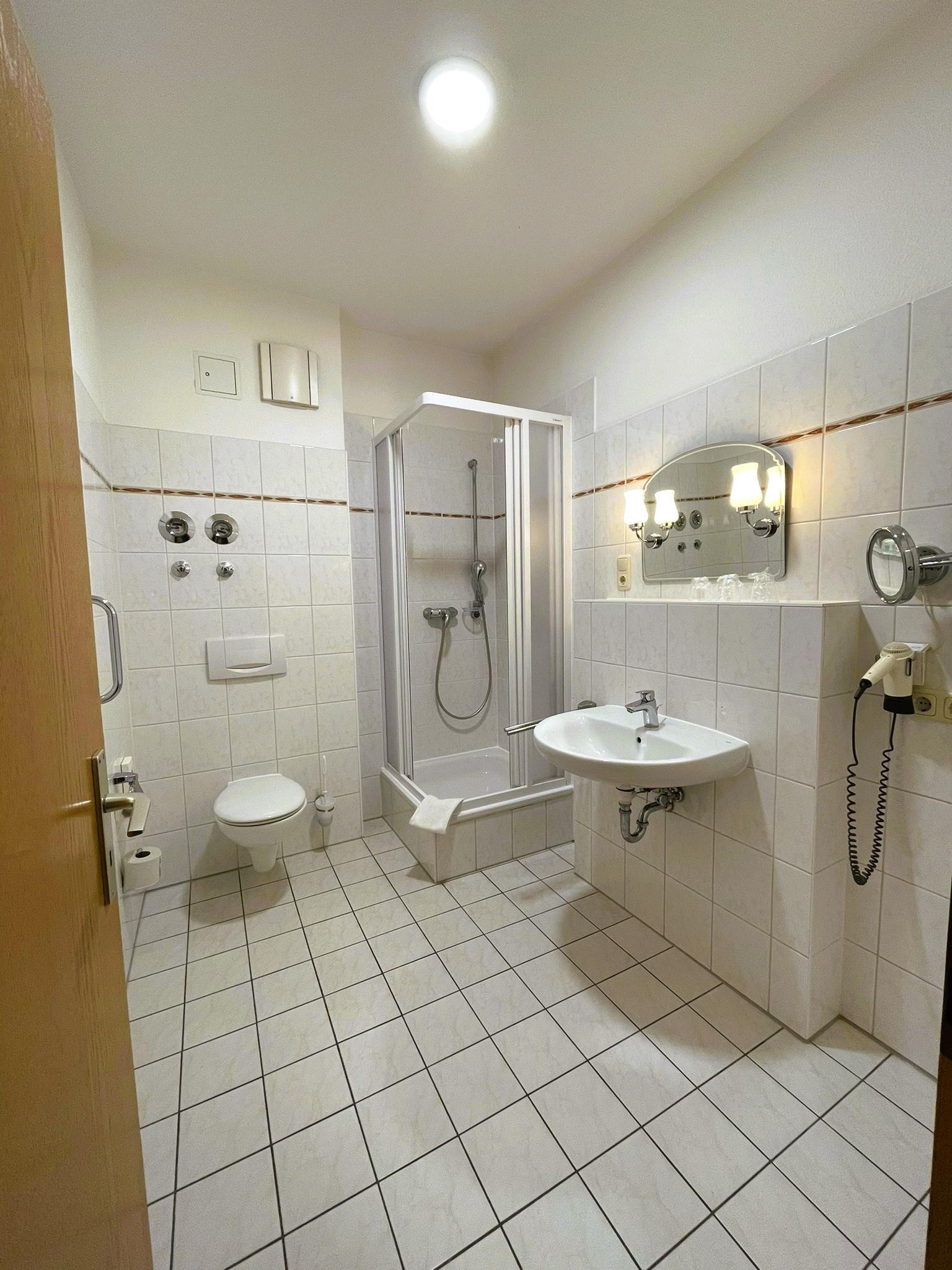 • Bad mit Dusche, WC, Föhn und beleuchtetem Kosmetikspiegel