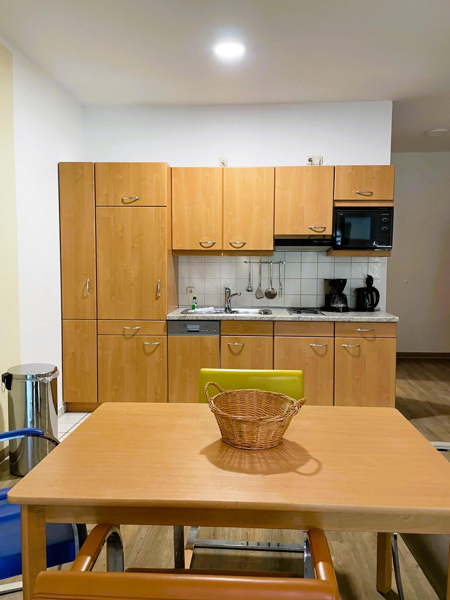 • Im Wohnraum integrierte Einbauküche, ausgestattet mit: 2-Platten-Kochfeld, Mikrowelle, Dunstabzugshaube, Kühlschrank mit Gefrierfach, Geschirrspüler, Toaster, Kaffeemaschine, Wasserkocher und Küchenutensilien