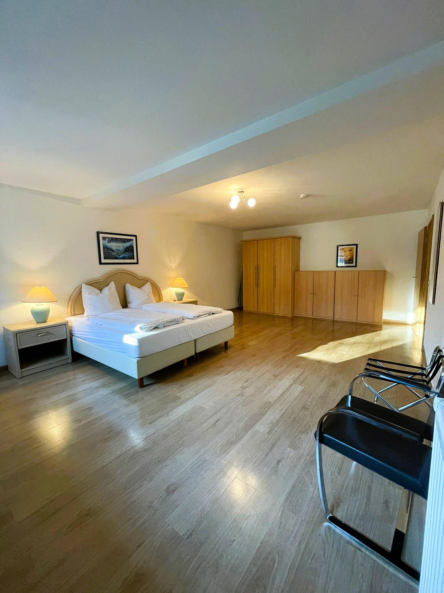 • Schlafzimmer mit Doppelbett (180 x 200 cm), Nachttischen, großem Kleiderschrank, Kofferablage